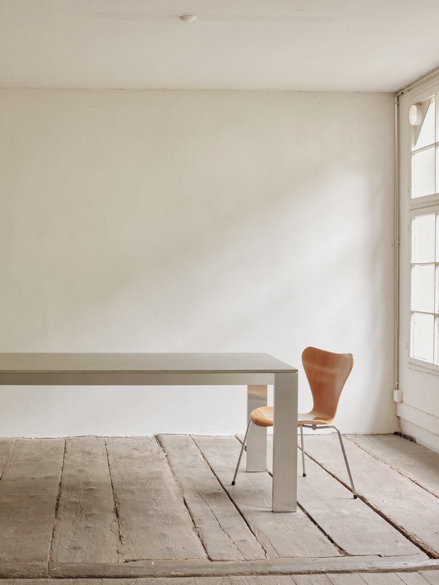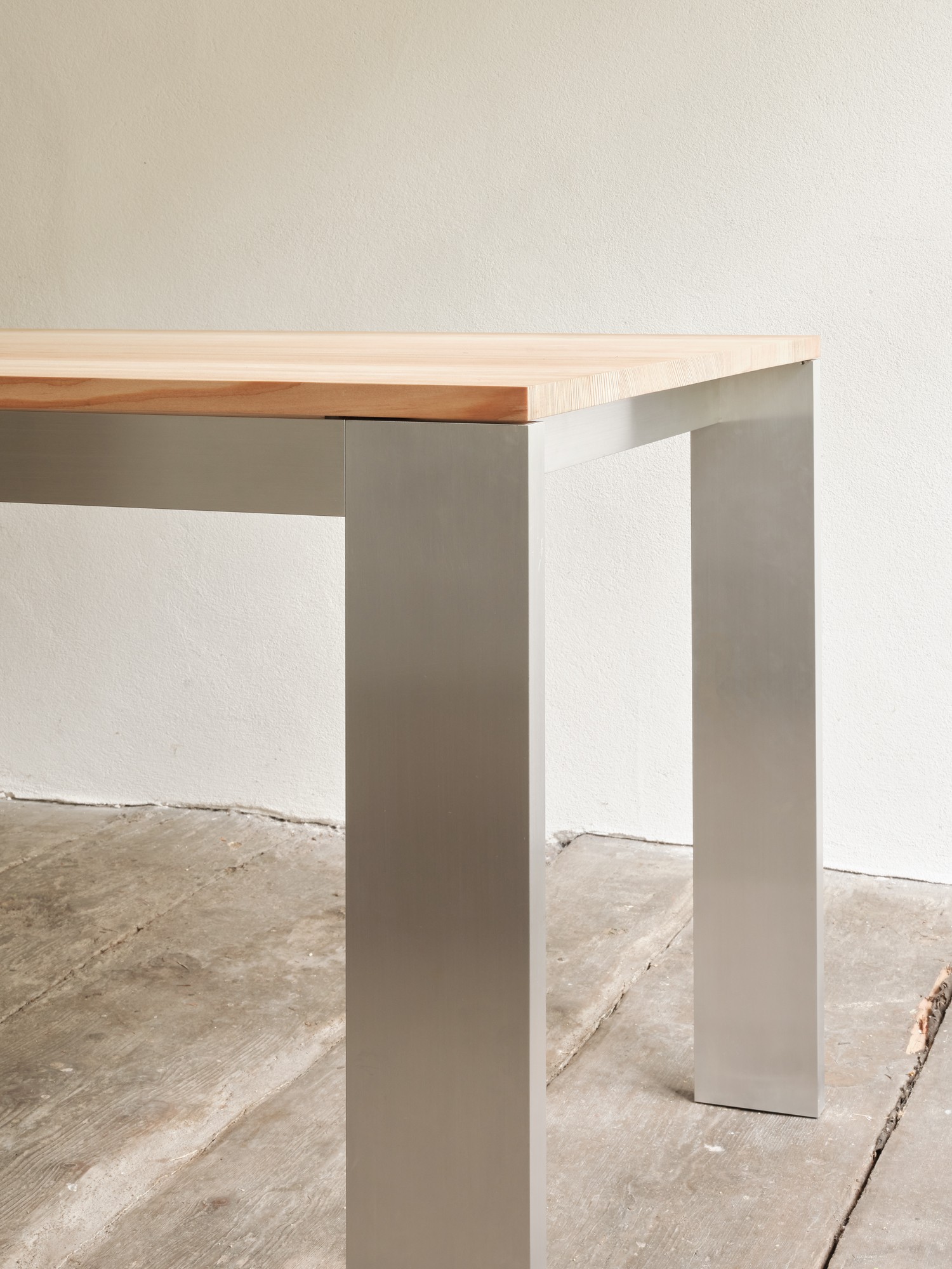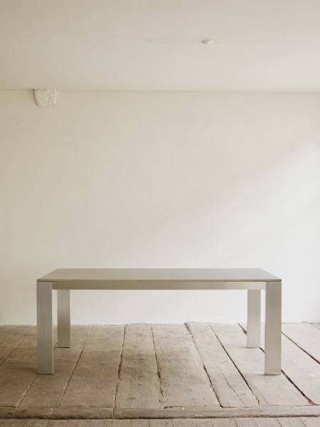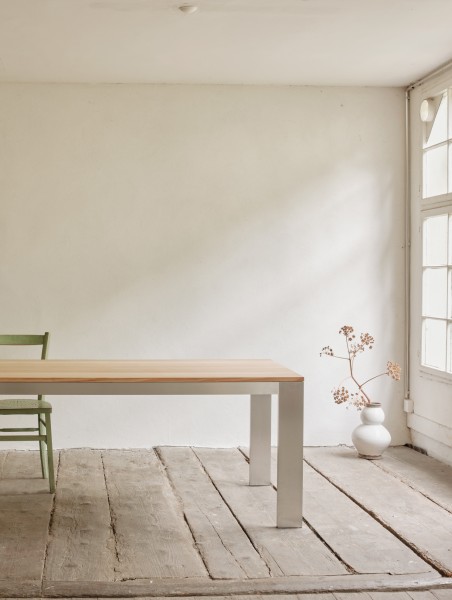 Tischgestell aus rohem Aluminium, wahlweise belegt mit einer geseiften Lärchenholz- oder einer Faserzementplatte.